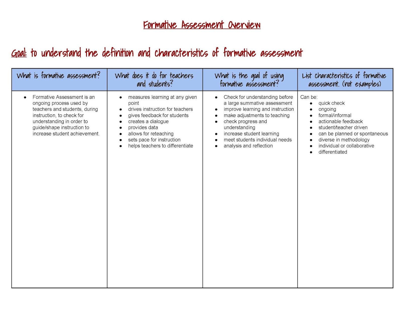 After our faculty chose formative assessment, we first had to build our common vocabulary on the topic of assessment. At a faculty meeting we compared summative and formative assessments, including definitions, characteristics, examples and non-examples. We eventually created a summary document we titled a Formative Assessment Overview. As a group, our common initial understanding of formative assessment was that it was something we did (check for understanding), rather than an ongoing process. Checking for understanding would become just one step in this process.